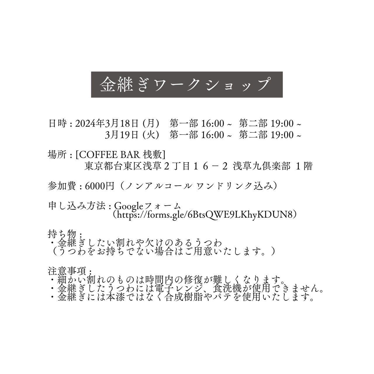 COFFEE BAR 桟敷 主催 2024年3月 金継ぎ 展示&体験ワークショップ企画
