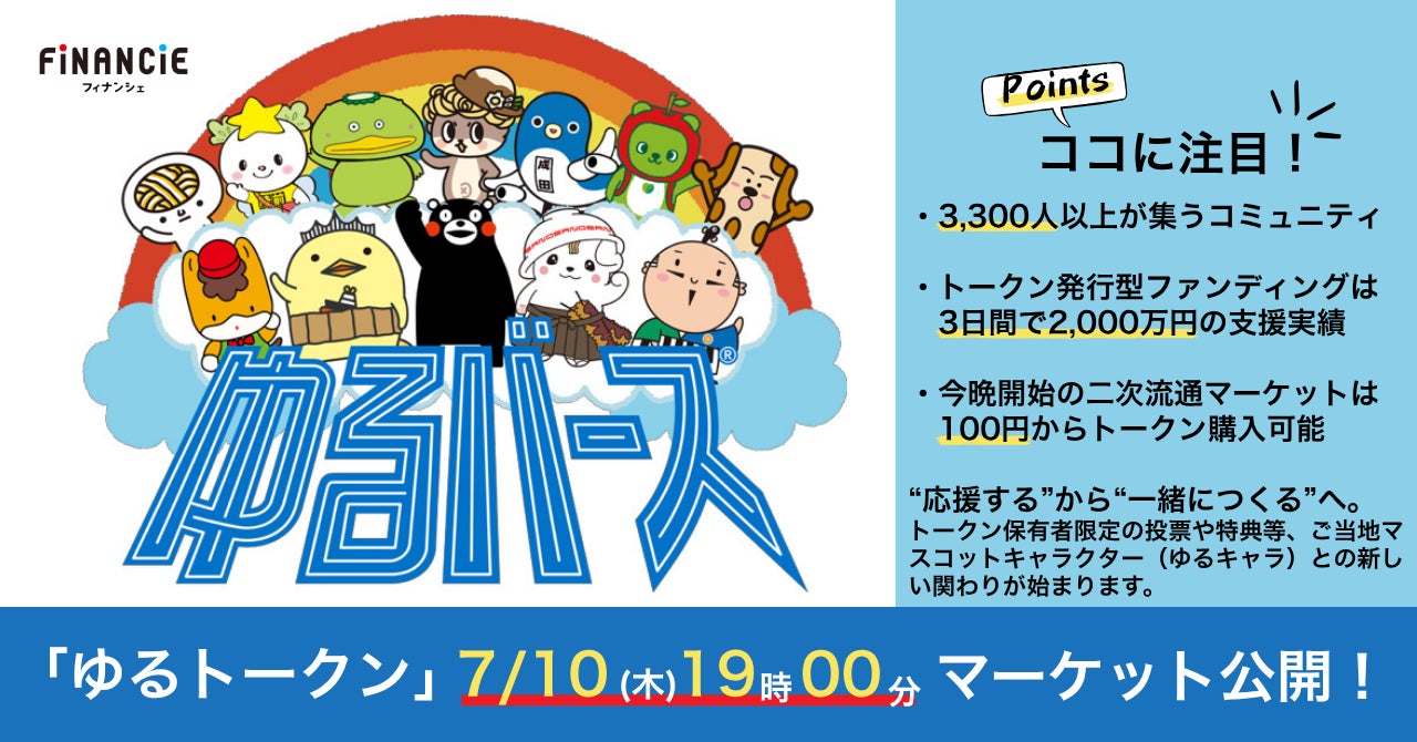 株式会社フィナンシェ(代表取締役:國光 宏尚、以下フィナンシェ)は、ゆるキャラグランプリ実行委員会と株式会社スマートリレーション(代表取締役:佐野 気理)が協業する「ゆるトークン」プロジェクトが本日7月10日19時より、FiNANCiEにてデジタルアイテム「トークン」の二次流通マーケットを公開しますことを知らせいたします。
