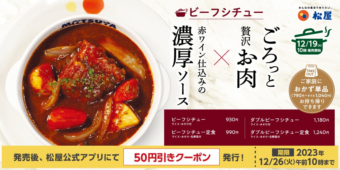 12月19日(火)10時~12月26日(火)10時まで、「ビーフシチュー」「ビーフシチュー定食」の50円引きモバイルクーポンを「松屋フーズ公式アプリ」にて配信いたします。※ダブルは対象外です。