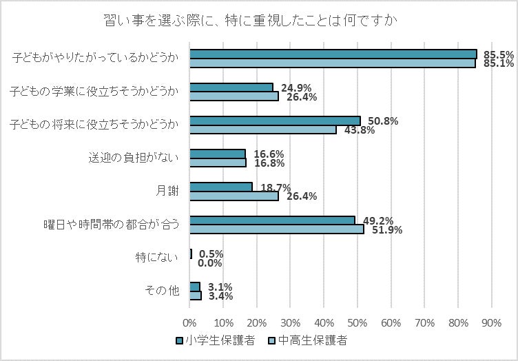 最も多くの保護者が重視したのは、「子どもがやりたがっているかどうか」で、約85%にのぼった。