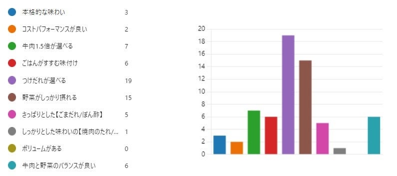 最も多くの票を集めたのは『つけだれが選べる』というポイントでした。2位は『野菜がしっかり摂れる』、3位は『牛肉1.5倍が選べる』でした。