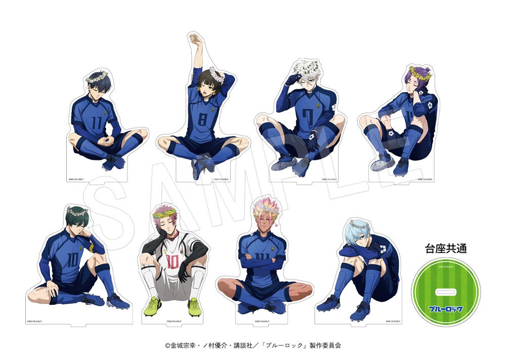 それぞれの誕生花の花冠を身に着け、うたた寝している潔たち8人の新規描き下ろしイラストを使用した「アクリルスタンド」や、ミニキャライラストを使用した「ステッカーセット」など様々なアイテムが販売決定!