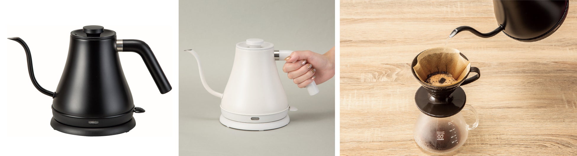 ラインアップは電気ドリップケトル、温度調整式電気ケトル、スチームオーブントースターで、シンプルながら使い勝手の良いキッチン家電を揃えました。