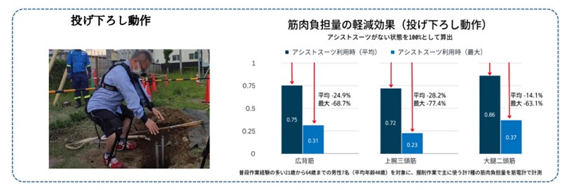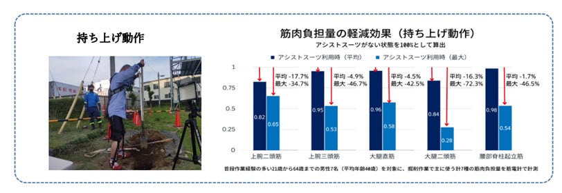 本製品の着用により、対象の筋肉における筋肉負担量が未着用時と比較して最大3~8割軽減する効果が見られました。