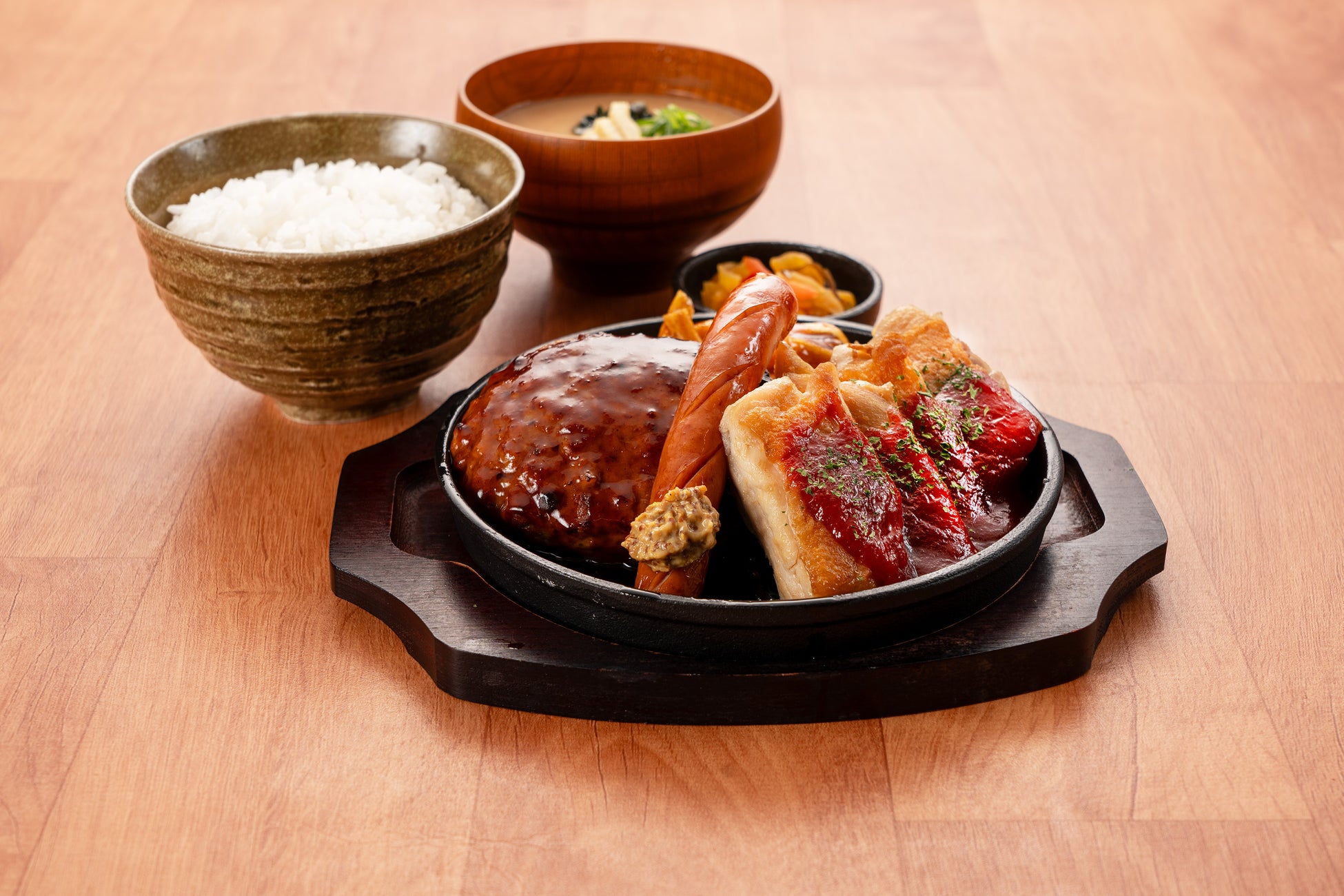 特製デミハンバーグ、グリルチキン、粗挽きウインナーが一度に楽しめる!