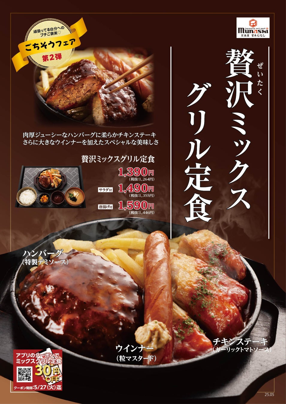 M&Sフードサービス株式会社(本社:大阪府大阪市、代表取締役社長:夏井 克典)が運営する定食チェーン「定食屋 宮本むなし」では、ごちそうフェア第2弾としてハンバーグ、チキンステーキ、ウインナーの3種を一度に楽しめるボリューム満点で食べ応え抜群の「贅沢(ぜいたく)ミックスグリル定食」を2025年5月14日より期間限定で販売いたします。