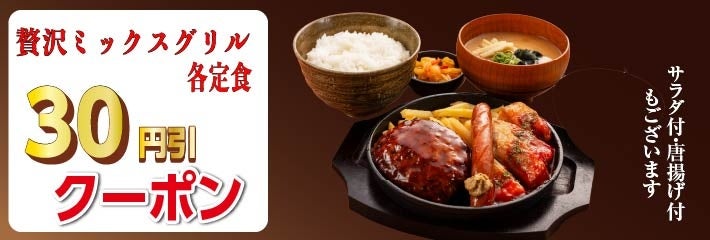 宮本むなし公式アプリでは、5月27日まで何度でも使える「贅沢ミックスグリル定食 30円引きクーポン」を配信いたします。会員の方限定でご利用いただけるクーポンですので、この機会にぜひ宮本むなし公式アプリをダウンロード&会員登録ください。