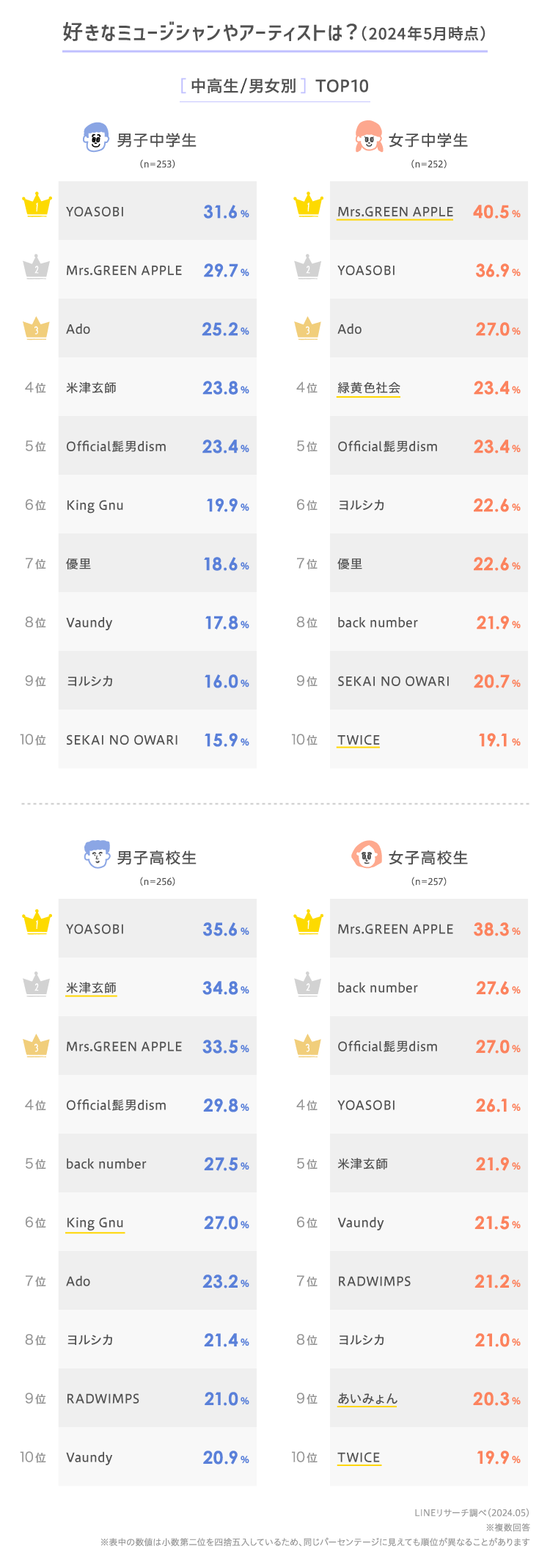 【LINEリサーチ】好きなミュージシャンTOP2は、中高生ともに「Mrs.GREEN APPLE」「YOASOBI」
