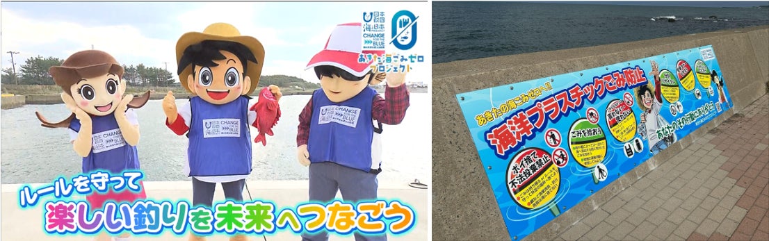 2024~2026年に実施した釣りマナーアンケートを基に、あきた海ごみゼロプロジェクトでは、2025年11月21日(金) ~11月30日(日)に「釣り場のマナーアップWEEK」を設け、釣り場のマナーアップCMを放送。また、道の駅象潟とにかほ市、秋田県由利地域振興局の協力を得て、クロダイシーズンには多くの釣り人で賑わい、近くには海水浴場や漁港もある、にかほ市・道の駅象潟ねむの丘の岸壁にごみの持ち帰りや海でのレジャーについてのマナーを啓発する看板を設置しました。ごみの持ち帰りやポイ捨てについてはもちろん、駐車マナーやライフジャケットの着用を釣りキチ三平が呼び掛ける内容になっています。