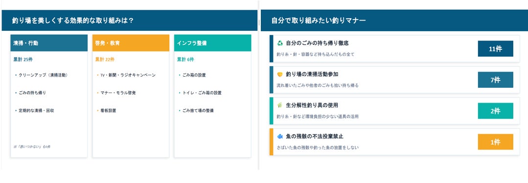 釣り人のマナー向上とごみ問題の解決には、継続的な啓発活動が大切となり、特にごみの持ち帰りやポイ捨て禁止、釣り場のごみ拾いについては、看板設置やメディアを活用し、当事者がメディアサインを目にする機会を増やし、定期的かつ長期的に呼びかけすることが効果的と考えます。