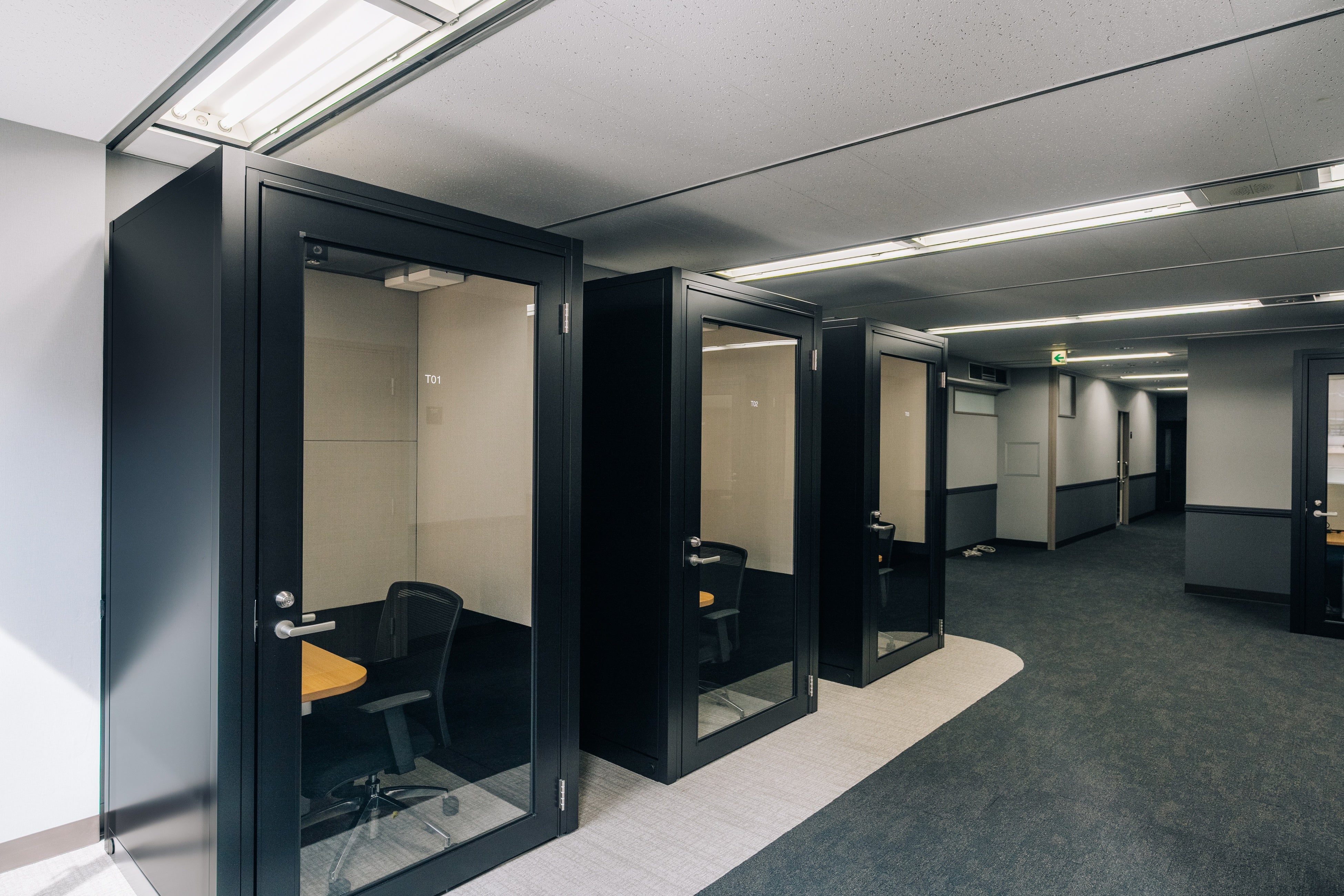 入居企業ごとの専用会議室としてご用意。シェアオフィスで起こりやすい会議室の予約の取りにくさを解消し、いつでも快適に会議が行えます。WEB会議等への対応として「個室(1人用)」を8箇所設置。