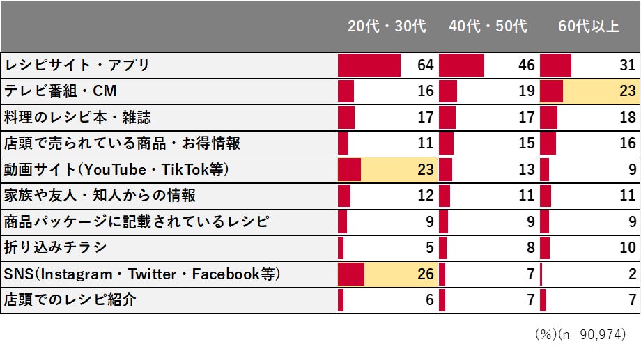 年代別でみると、60代以上では「テレビ番組・CM」を参考とする人が他の年代と比べて多かった。20代・30代では「動画サイト」「SNS」を参考とする人が多く、オンラインサービスを活用して献立を検討する傾向がみられる。