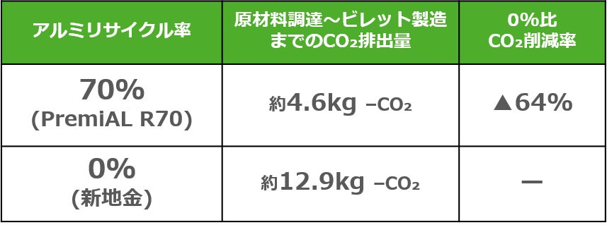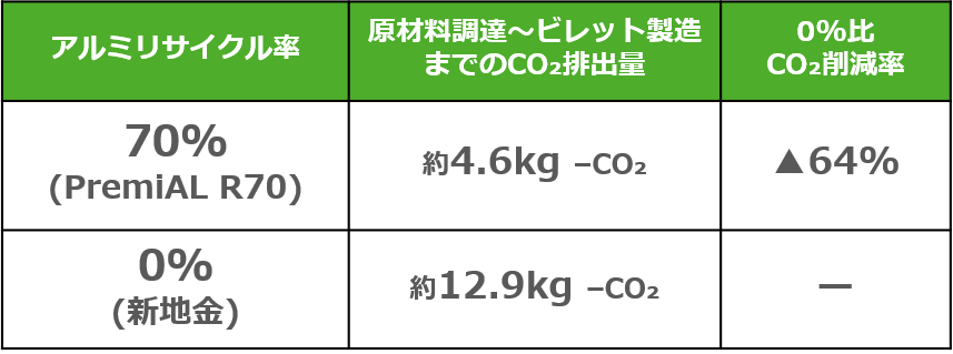 「PremiAL R70」は原材料の70%にアルミリサイクル材を使用した循環型低炭素アルミ形材です。「PremiAL R70」1㎏あたりの原材料調達からビレット製造までのCO₂排出量は4.6㎏で、新地金を100%使用したアルミ形材のCO₂排出量12.9kgと比較すると、約64%(※)のCO₂排出削減に貢献します。