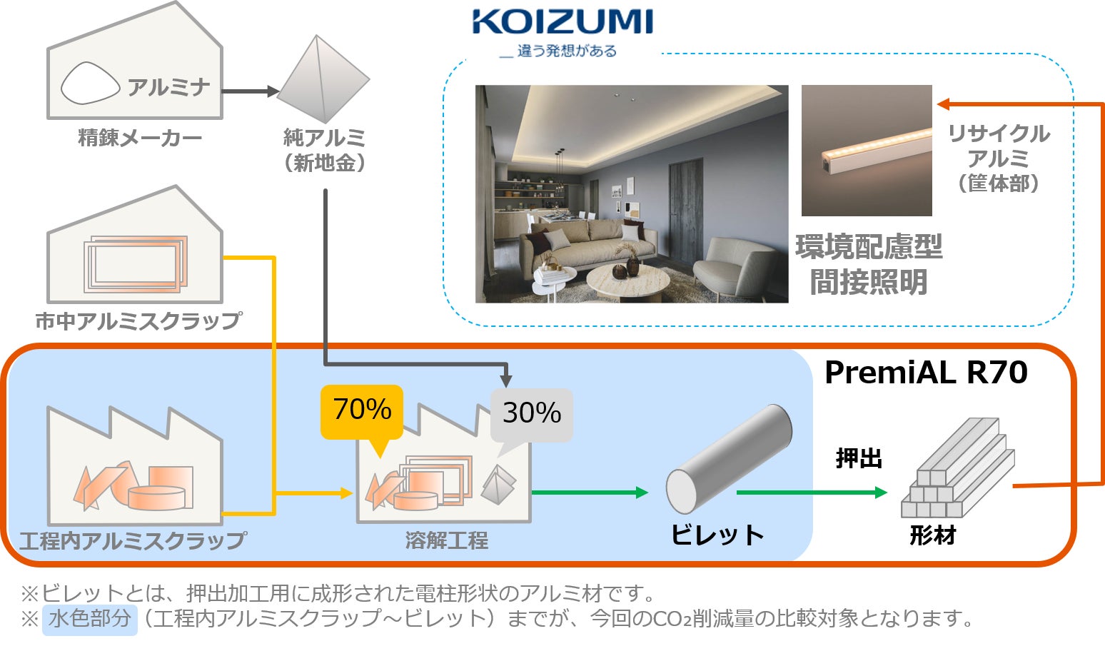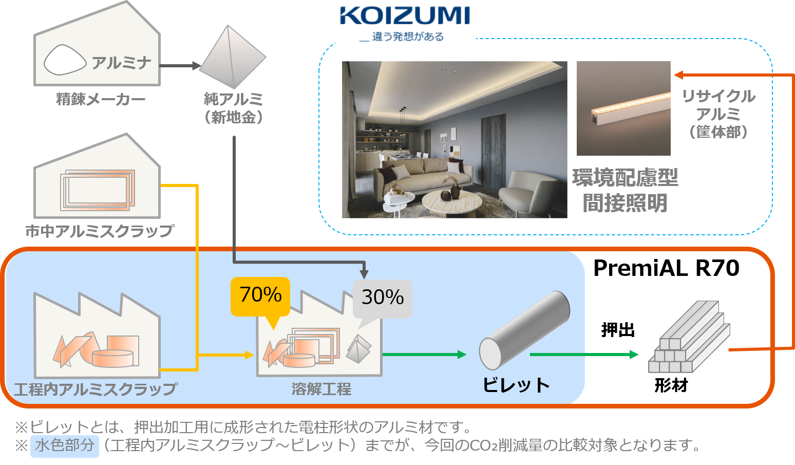 今回は「PremiAL R70」を使用した照明器具第1弾として、間接照明シリーズのライトバー間接照明(ミドルタイプ)の筐体部に同素材を使用した照明器具が展開されます。「PremiAL R70」を導入いただくことにより、原材料調達からビレット製造までのCO₂排出量は、リサイクル材を使用しないアルミ形材を導入した場合と比較すると、約64%のCO₂排出量を削減することが可能となります。