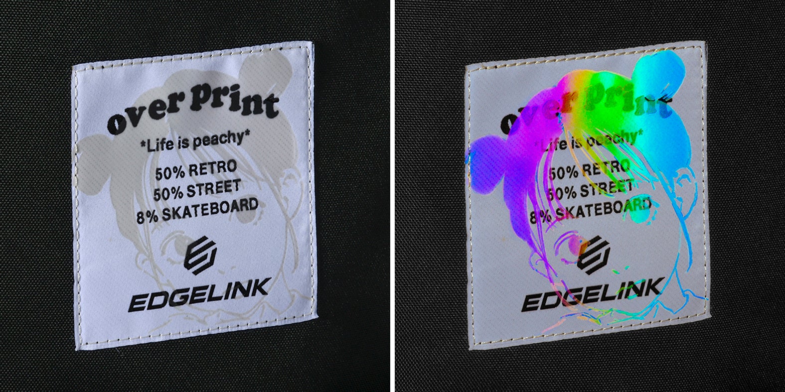 オーロラ色に輝く特許技術のプリントを施したコラボ特製タグ