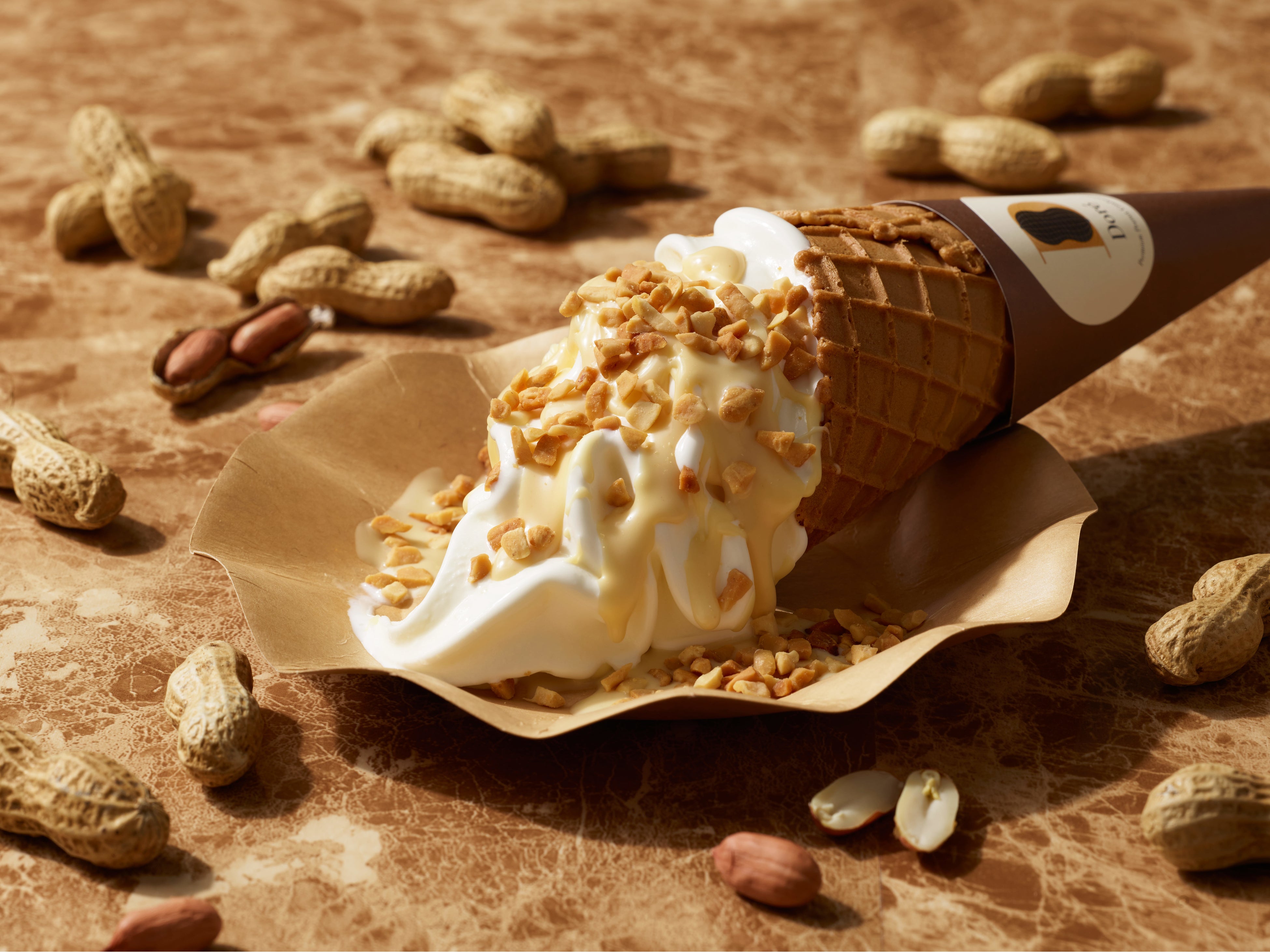 北海道産ミルクと八街産の落花生のハーモニーを贅沢に楽しめる、絶品なピーナッツソフトクリーム。ミルク味のソフトクリームにピーナッツショコラをあしらい、ピーナッツのダイスを散りばめました。コーンの底までピーナッツショコラが入っているので、最後の一口まで堪能していただけます。