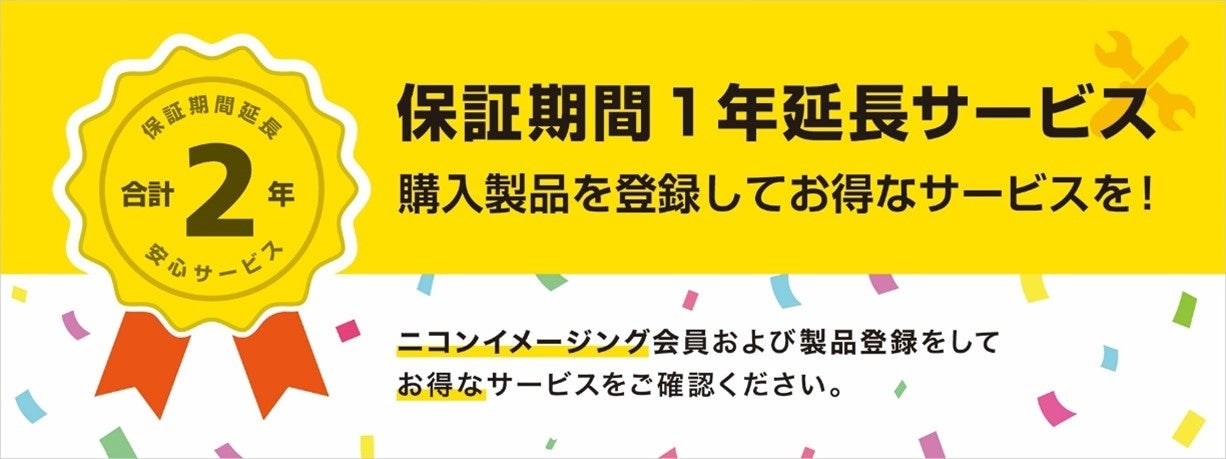 今回、お持ちのニコン製品を長く安心・安全にご利用いただけるよう、対象製品をご購入のうえ、ニコンイメージング会員および製品登録をしていただいたお客様へ、株式会社ニコンが発行する1年間のメーカー保証を2年間に延長する「保証期間1年延長サービス」を特典に追加いたします。