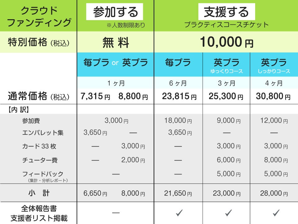 無料で1ヶ月のプラクティスに参加できます。プロジェクト支援金が目標に達成次第、「毎プラ」および「英プラ」のプラクティスコースへ、それぞれ先着50名の方にご参加いただけます。
