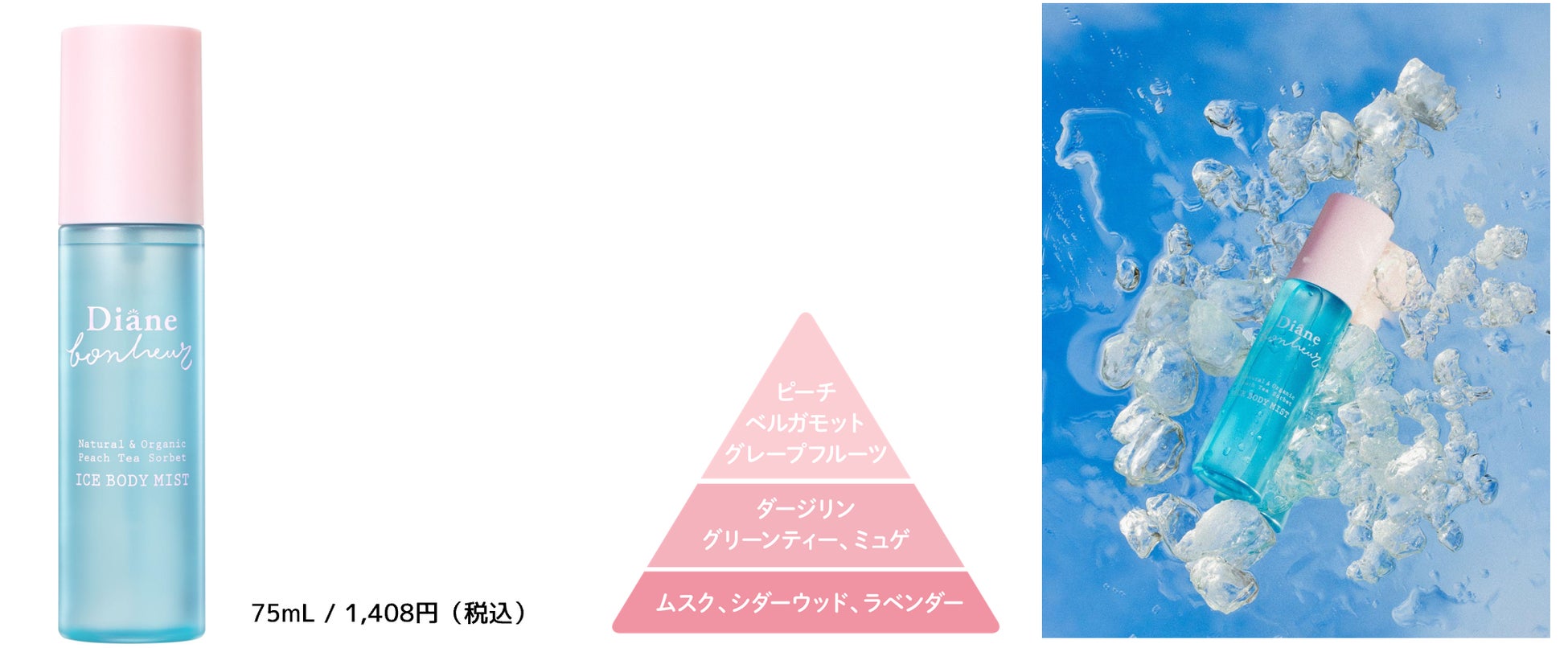 今回ご提供する「アイスボディミスト(ピーチティーソルベの香り)」は、同ブランドとしては初となるアイスシリーズで、スーッとするクール感を感じていただけるメントールを配合した爽やかな「ピーチティーソルベの香り」。フランスの避暑地でシャーベットを食べて涼むシーンをイメージした、ダイアンボヌールがこだわる香りからも爽快感を感じられるアイテムです。