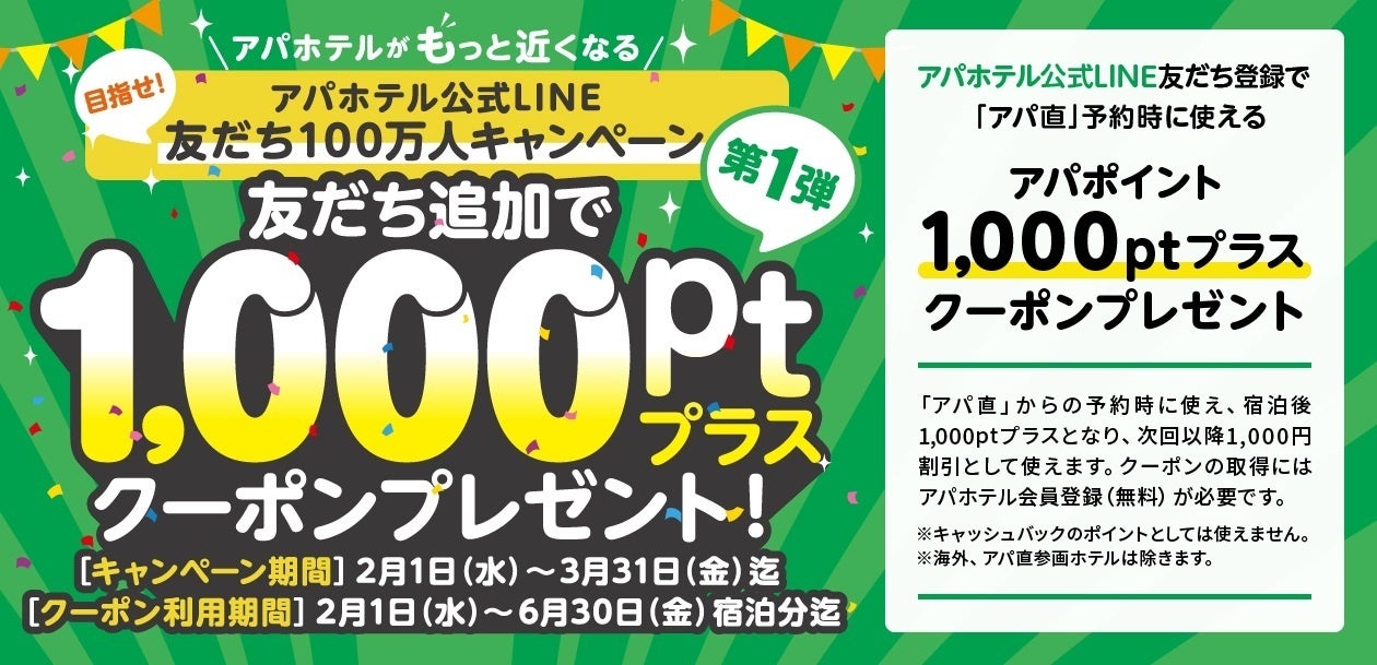「目指せ!アパホテル公式LINE 友だち100万人キャンペーン 第1弾」では、アパホテル公式LINE友だち登録で、「アパ直」予約時に使えるアパポイント1,000ptプラス クーポンをもれなくプレゼントします。クーポンは利用期間中、「アパ直」から予約時に使え、 宿泊後1,000ptプラスとなり、次回以降1,000円割引として使うことができます。