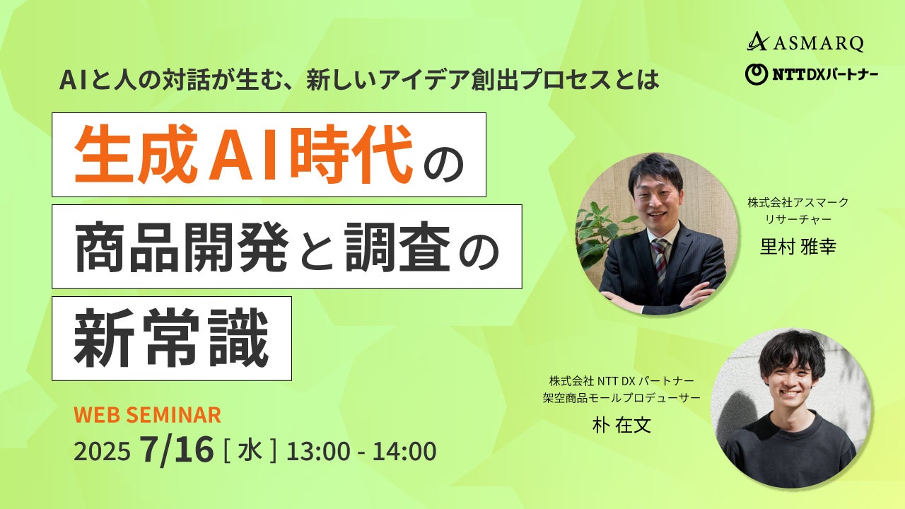 株式会社アスマーク(東京都渋谷区東、代表取締役:町田正一)は、2025年07月16日(水)13:00に、「生成AI時代の商品開発と調査」をテーマに、従来にはなかった新しい発想と意思決定のプロセスを具体的な事例や対談を交えて紹介する新セミナーの開催についてご案内いたします。