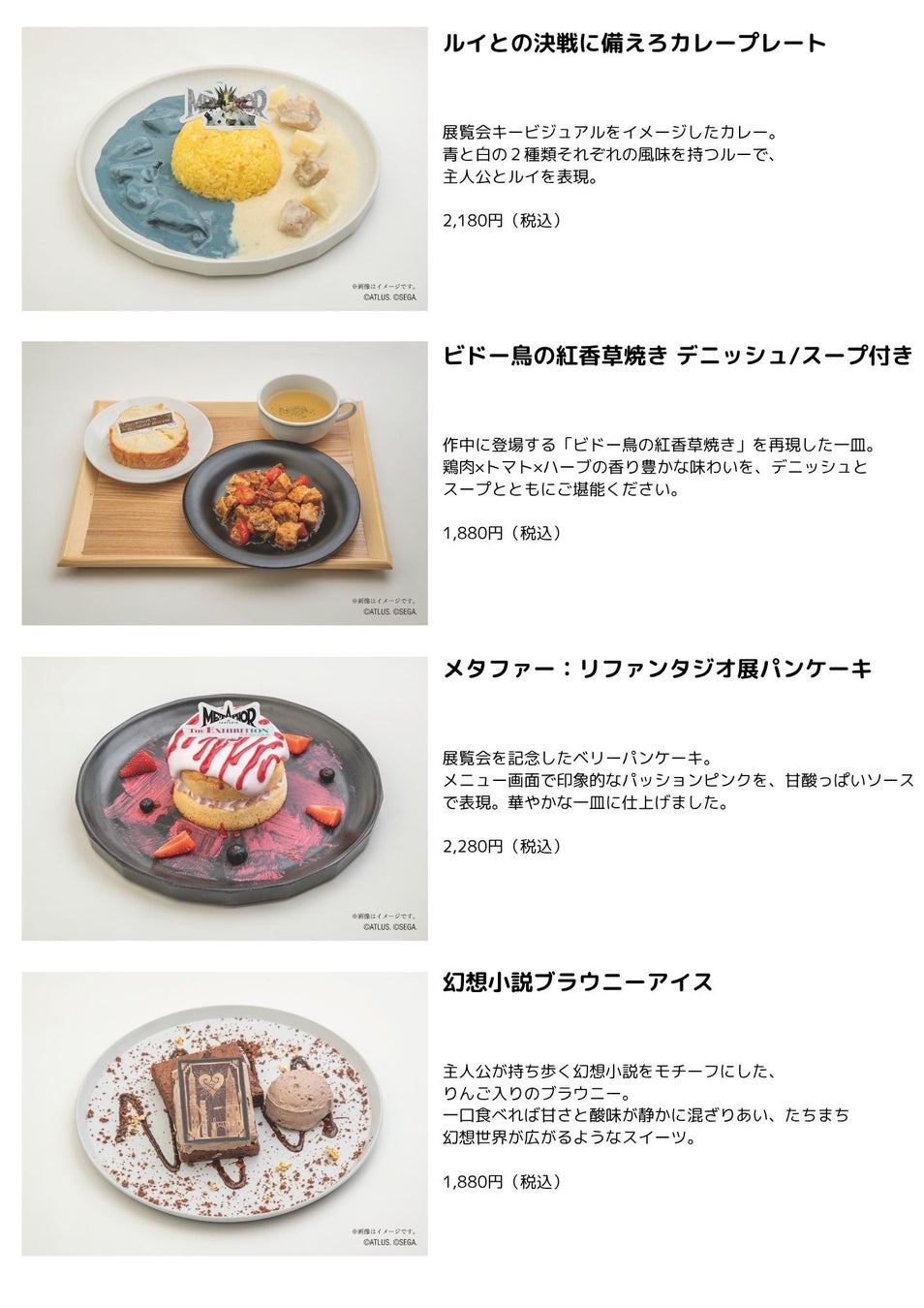 【メタファー:リファンタジオ展コラボレーションカフェ】は、複合型商業施設・なんばパークス内『なんばパークスミュージアム』で開催される展示会「メタファー:リファンタジオ展」と連動したコラボカフェ企画となっております。店内のコラボレーションスペースは【メタファー:リファンタジオ展コラボレーションカフェ】仕様に装飾され、この企画のために開発されたメニューは、ストーリーを忠実に再現したクオリティの高いものに仕上がっております。例えば、「ビドー鳥の紅香草焼き デニッシュ/スープ付き」は作中に登場する「ビドー鳥の紅香草焼き」を再現したメニュー。また、展示会のキービジュアルをイメージした「ルイとの決戦に備えろカレープレート」もまた、特別感を演出する一皿となっております。各キャラクターをイメージしたドリンクにはストロータグの特典が付くなど、細部まで工夫を凝らしたメニューをお楽しみください。