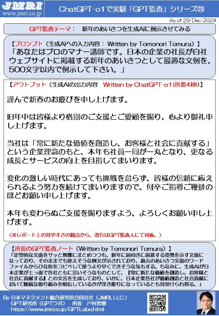 ChatGPT「o1」で新年の社長のあいさつ文を出力させてみた(所要4秒の爆速ご挨拶): GPT監査レポート第23号(by GPT監査人 戸村智憲)【日本マネジメント総合研究所合同会社】