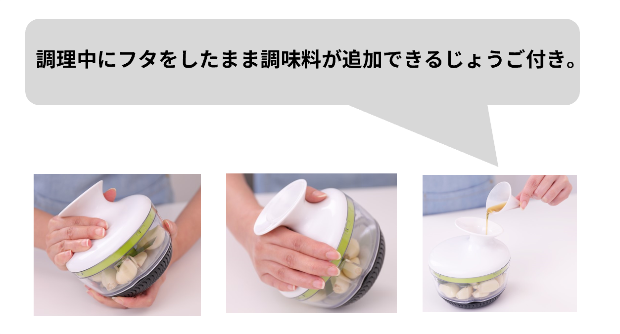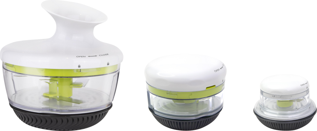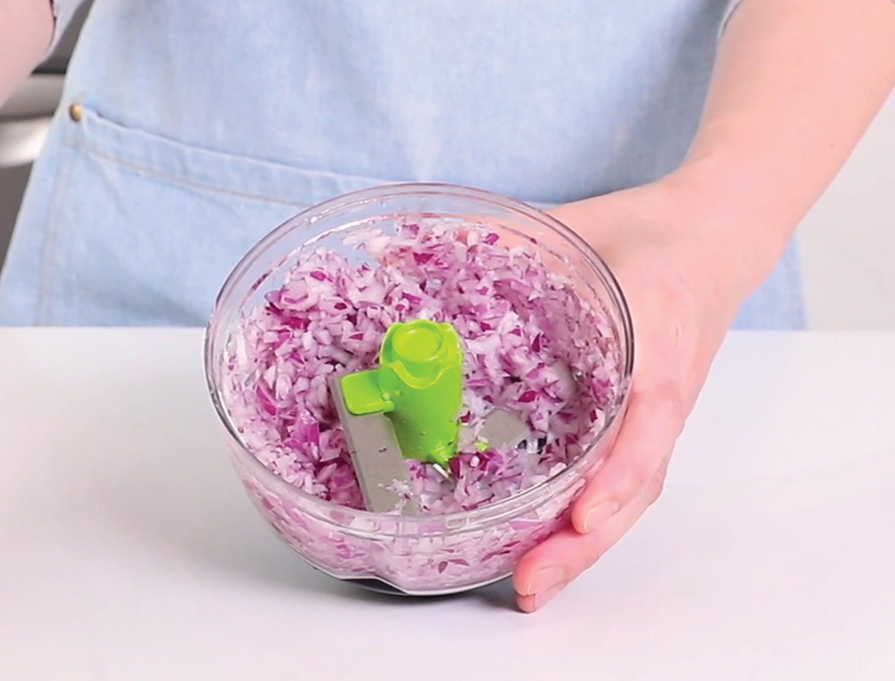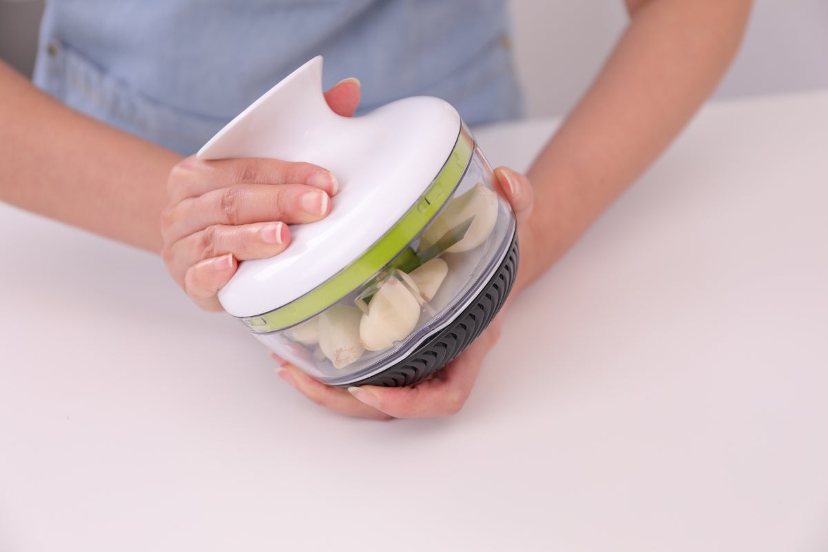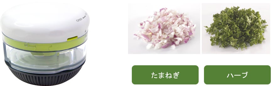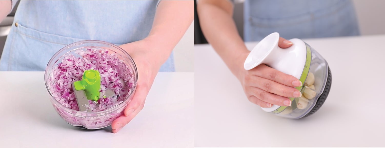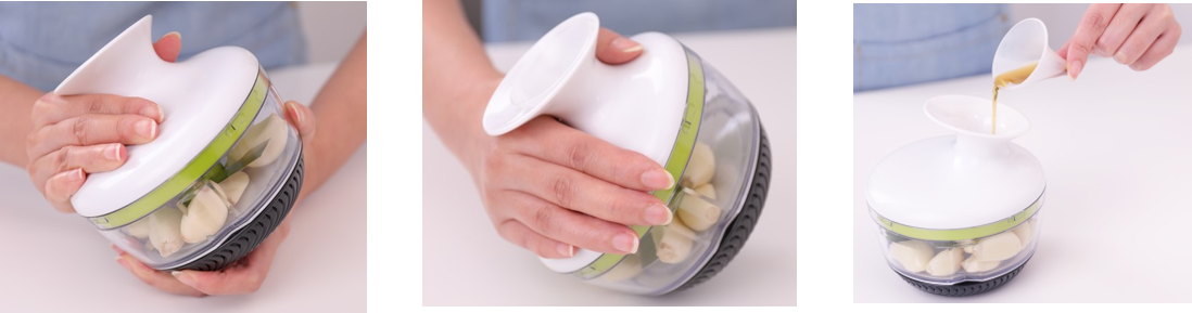食材を入れてフタを閉め、くるくるひねって、ころころ転がすだけで、楽しくみじん切りができます。人間工学に基づいたデザインで、片手で簡単に調理できます。