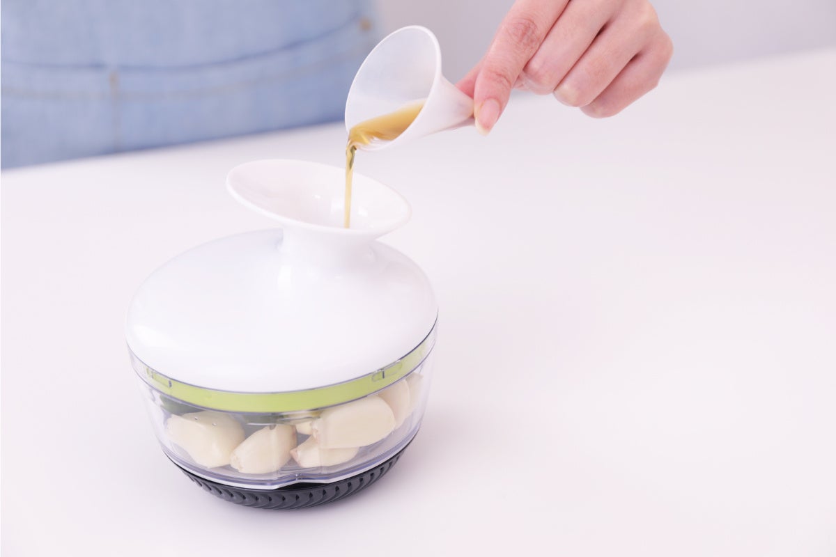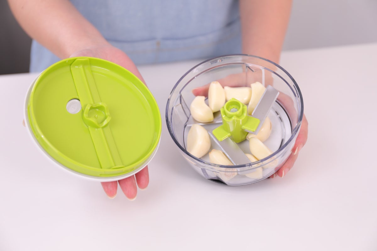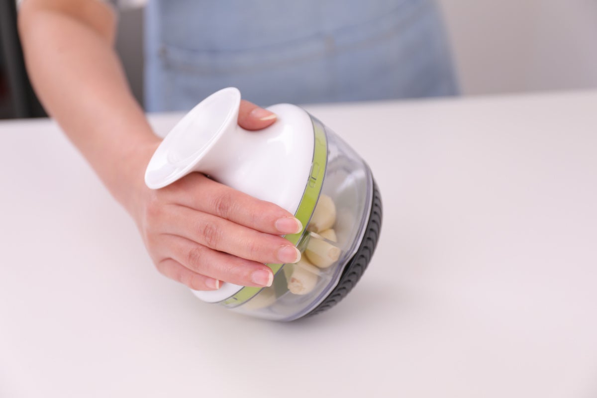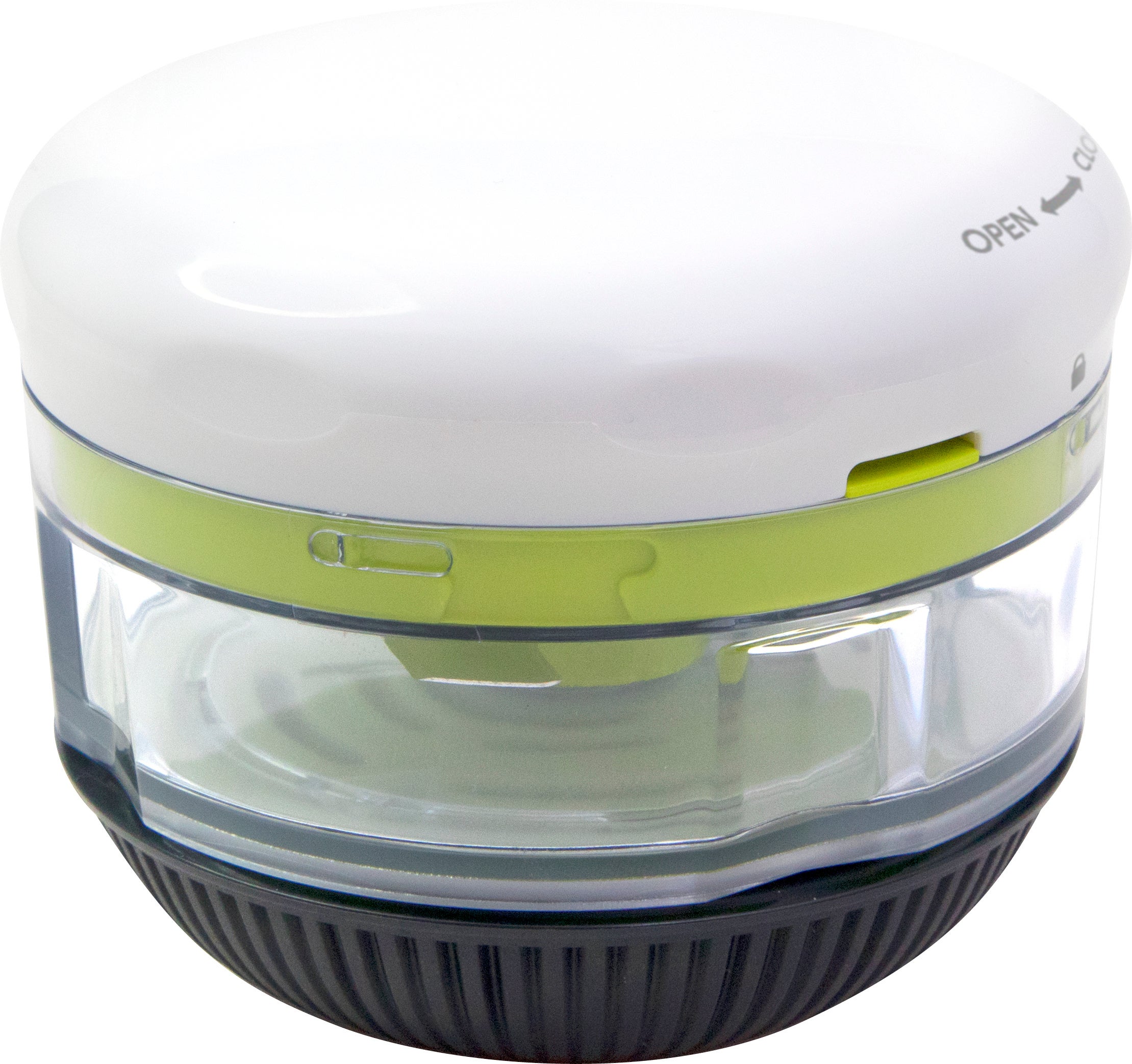 食材を入れてフタを閉め、くるくるひねって、ころころ転がすだけで、楽しくみじん切りができます。人間工学に基づいたデザインで、片手で簡単に調理できます。