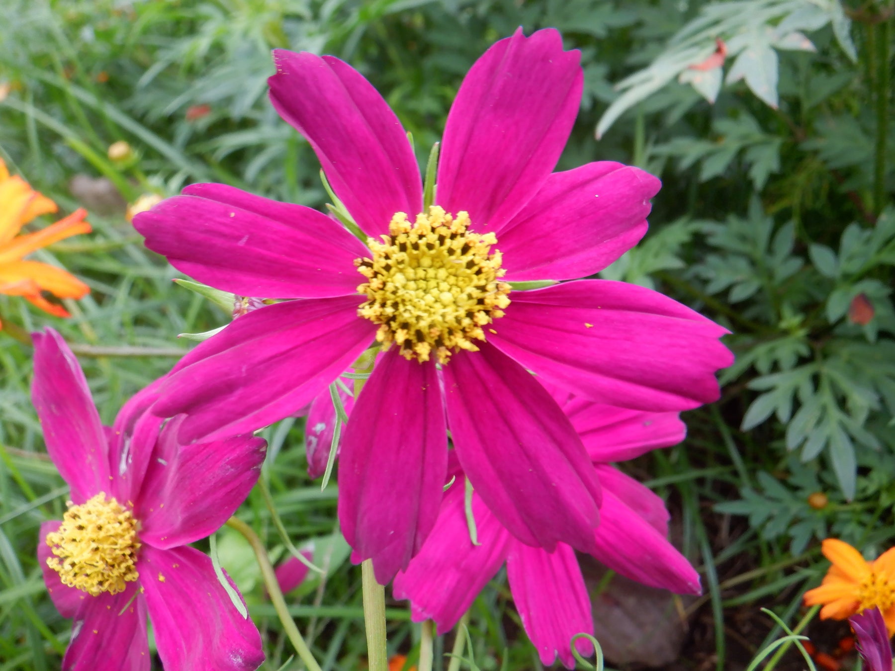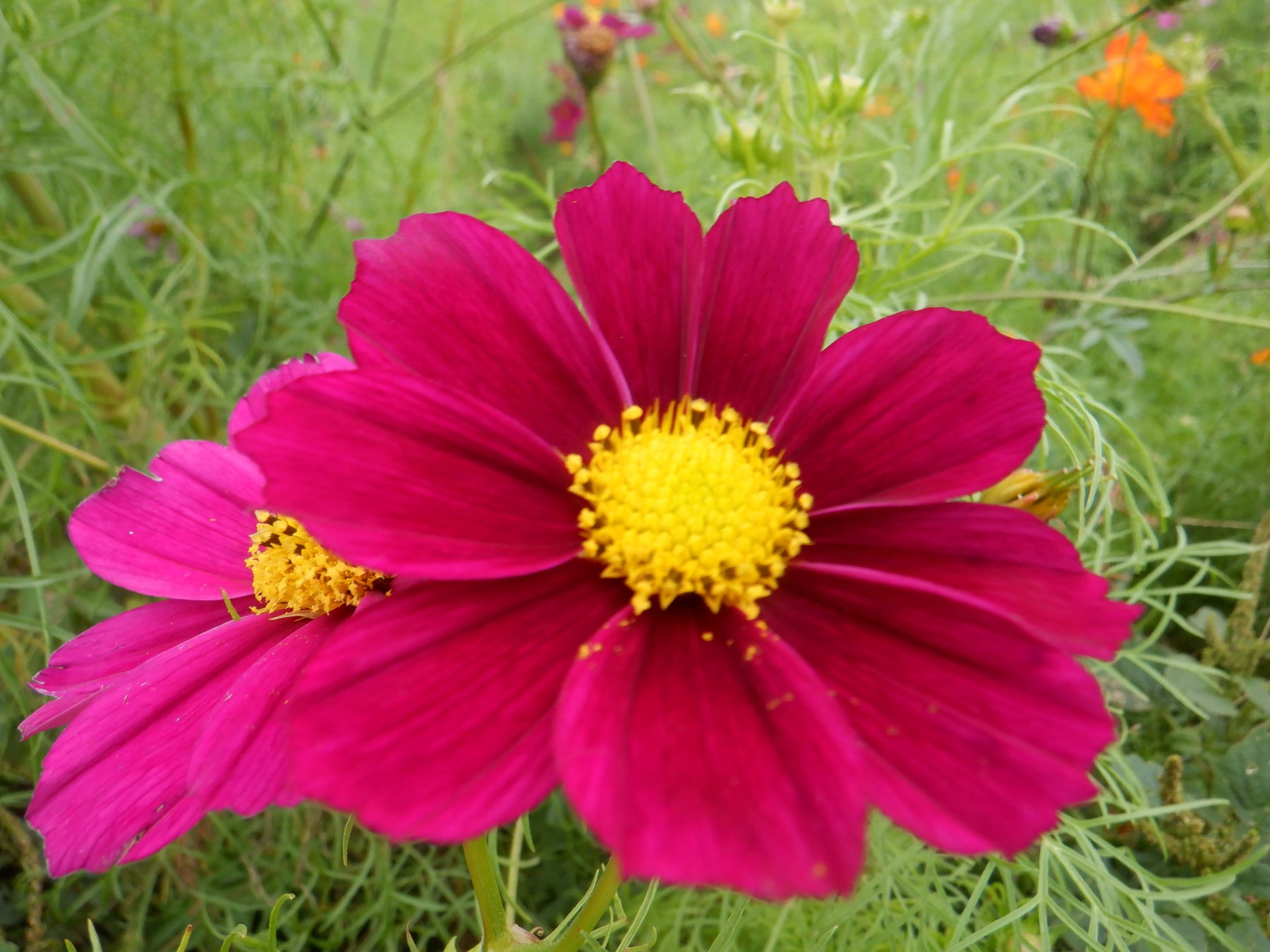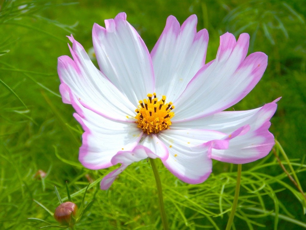 コスモスはキク科コスモス属の一年草で、夜が長くなると花芽をつける「短日植物」です。ギリシャ語で「美しさ」や「秩序」を意味する「kosmos」を語源とし、和名では花の形が桜に似ていることから「秋桜」とも呼ばれています。