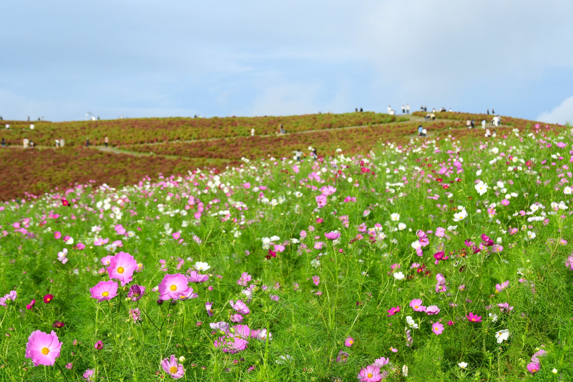 国営ひたち海浜公園の「みはらしの丘」では、約236万本のコスモスが14日に見頃(7分咲き)を迎えます。丘を縁取るように一斉に花を咲かせ、風に揺らぐ姿はまさに秋の風物詩。見頃は27日頃まで続く見込みで、丘のふもとを彩る赤・白・ピンクのコスモスと、まもなく紅葉を迎えるコキアとのコラボレーションをお楽しみいただけます。
