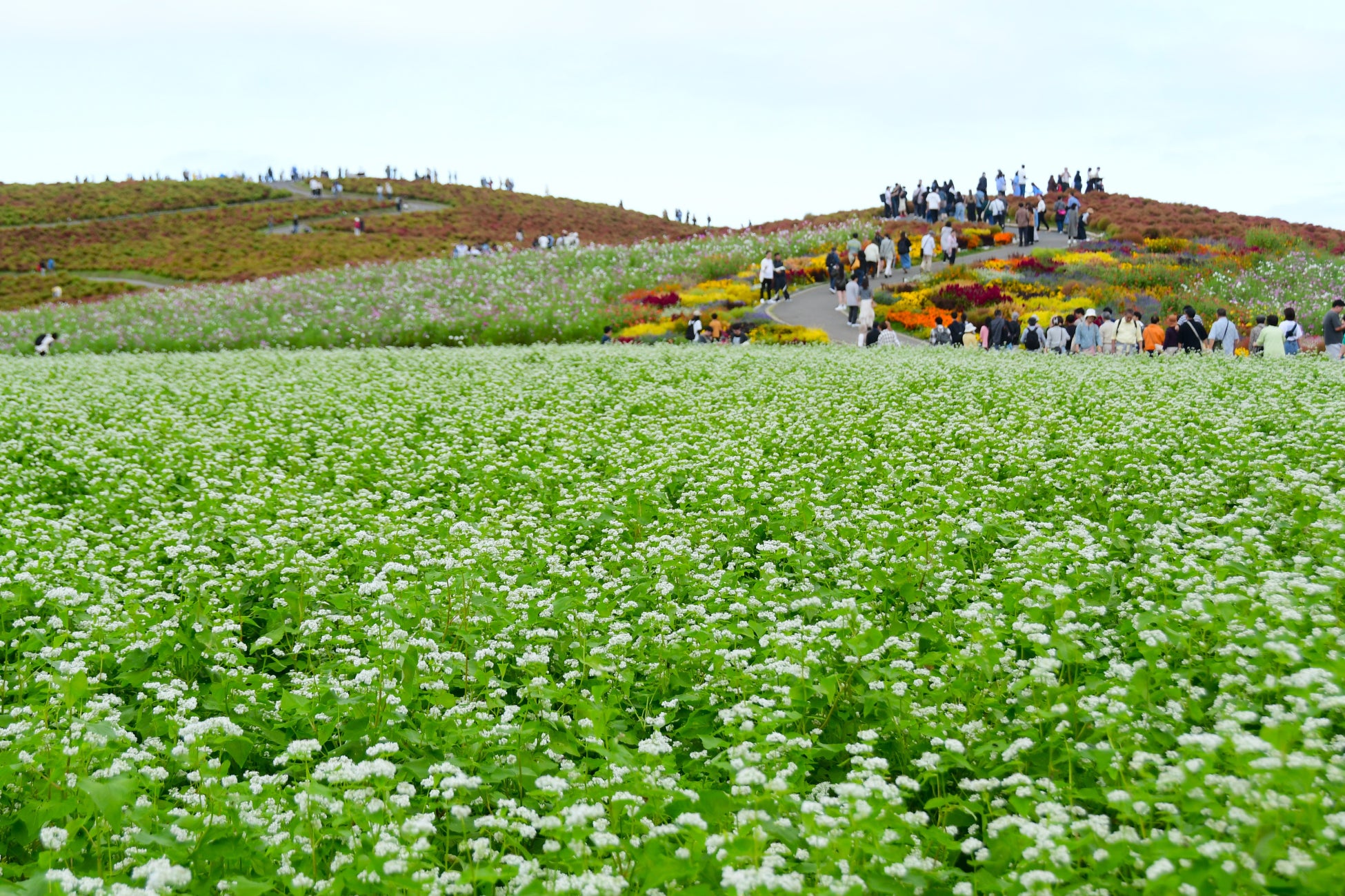 みはらしの丘ふもとの「みはらしの里」では、秋の植物がコキアの紅葉にあわせて花を咲かせます。鮮やかなオレンジ色のキバナコスモスや、こんもり丸いシルエットが可愛らしいマルチフローラマム、茨城県のブランド品種「常陸秋ソバ」と、赤い花を咲かせる「高嶺ルビー」も見どころです。また、常陸秋ソバの花畑では、扉のフォトスポットも設置。扉の向こうに広がるコキアを背景に記念撮影をお楽しみください。