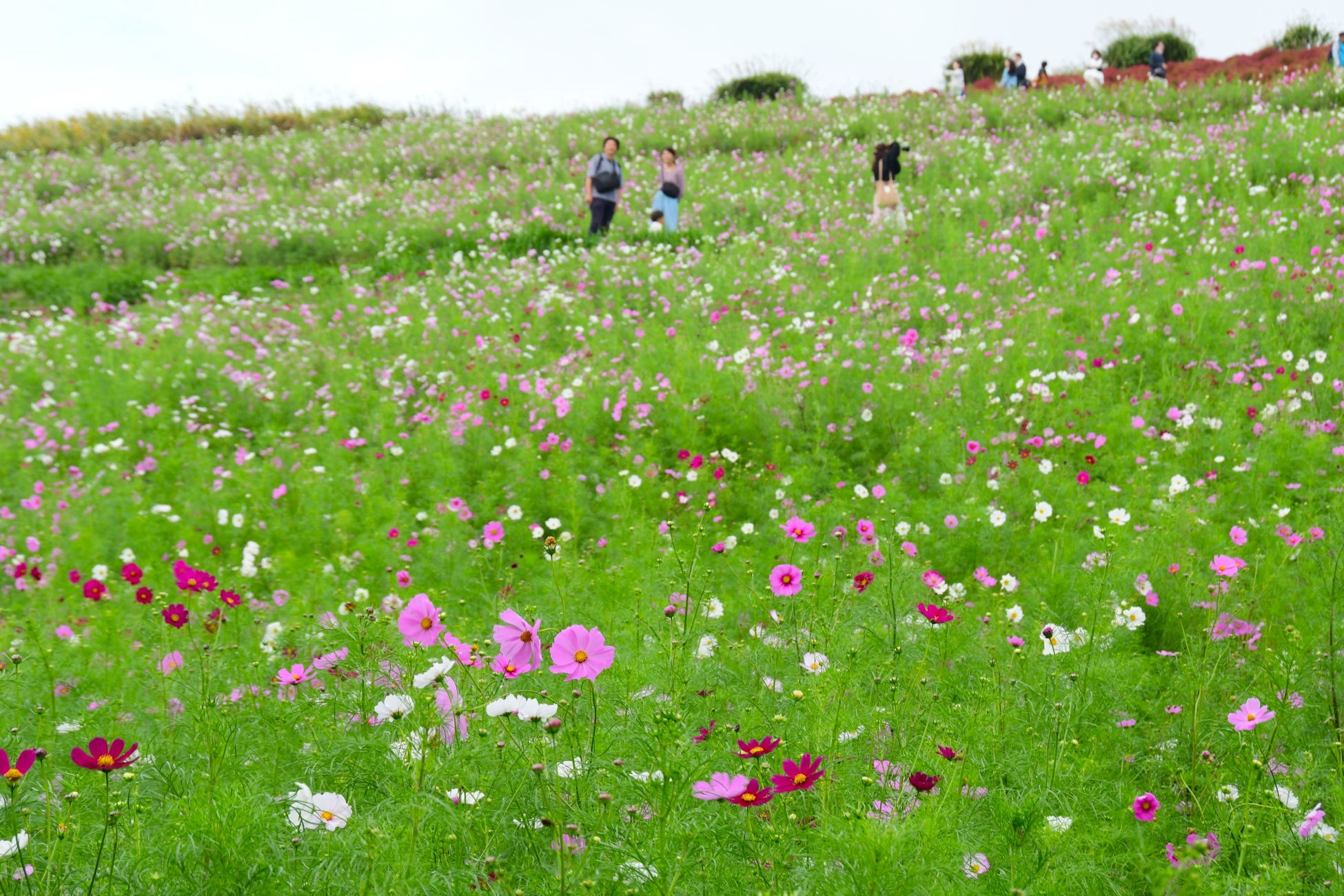 今年はコキア紅葉見頃とコスモスの見頃を合わせるため、大輪で開花の早い品種「センセーション」を昨年の7割から9割へ増やしました。また、遅咲き品種の「秋咲き大輪」を植栽しており、できるだけ長い期間コスモスをお楽しみいただけるよう工夫しています。そのため、丘を縁取るように咲き誇るコスモスと、丘一面を真っ赤に染め上げるコキアとの共演をご覧いただけます。