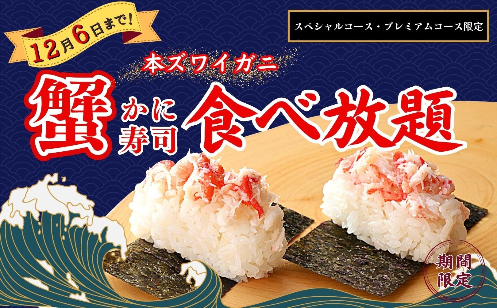 【食欲の秋は“蟹寿司”食べ放題で決まり‼】12/6迄の特別企画!『ザ ブッフェ ニューマーケット』など10店舗のスペシャルコース以上に、本ズワイガニをふんだんに乗せた『蟹寿司』が新登場!