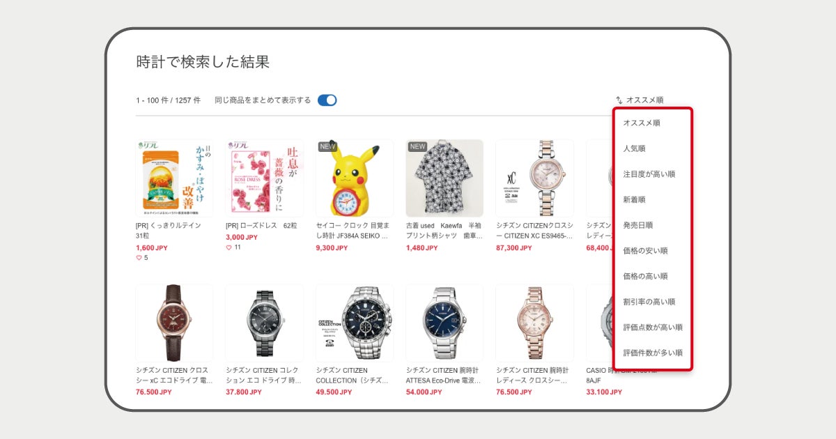 「人気順」「注目度が高い順」「発売日順」「割引率の高い順」など充実した並び替え項目を実装しました。これにより、検索結果ページの商品の表示順をユーザーごとの目的やニーズに合わせて柔軟に並び替えることができるようになるため、ECサイトの利便性向上に寄与します。