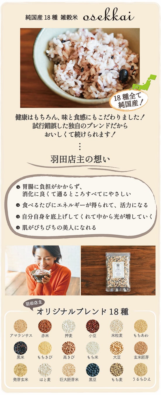 「お腹の中から綺麗になれて、お肌もツルツル、消化がよく栄養満点、食べやすい雑穀米を、、、という私のわがままを雑穀エキスパートの浅沼さんが根気よく聞いて、形にしてくれたのが『osekkai雑穀米』です。周りの方の健康に非常におせっかいな私の性格をネーミングされました。