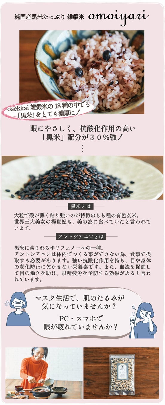 それならば、、ということで黒米を濃厚にブレンドして誕生したのが『omoiyari雑穀米』です。