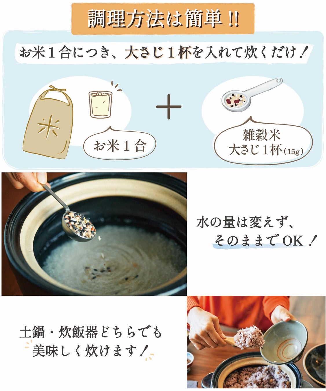 ※お米1合につき、雑穀を大さじ1杯(15g)入れ、お水の量は変えずに炊いて下さい。
