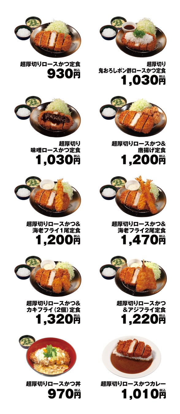 商品名 超厚切りロースかつ定食 930円 超厚切り味噌ロースかつ定食 1,030円 超厚切り鬼おろしポン酢ロースかつ定食 1,030円 超厚切りロースかつ&唐揚げ定食 1,200円 超厚切りロースかつ&海老フライ定食 (1尾)1,200円/(2尾)1,470円 超厚切りロースかつ&カキフライ(2個)定食 1,320円 超厚切りロースかつ&アジフライ定食 1,220円 超厚切りロースかつ丼 970円 超厚切りロースかつカレー 1,010円 ※お持ち帰りいただけます。お持ち帰りのみそ汁は、別途60円でお買い求めいただけます。 ※全て税込価格です。また、店内・お持ち帰りの税込価格は同一です。 ※株主優待券は上記全てのメニューにご使用いただけます。(単品は除きます。) ※マイカリー食堂併設店では「超厚切りロースかつカレー」の価格が異なります。 ※高速PA店舗では価格が異なります。 発売日 2023年12月20日(水)午後3時 対象店舗 一部店舗を除く全国の松のや 183店舗 下記URLをご参照ください。 ※松屋併設店、沖縄店舗を除く URL:https://pkg.navitime.co.jp/matsuyafoods2/?dc={%27c_campain69%27:%271%27} |