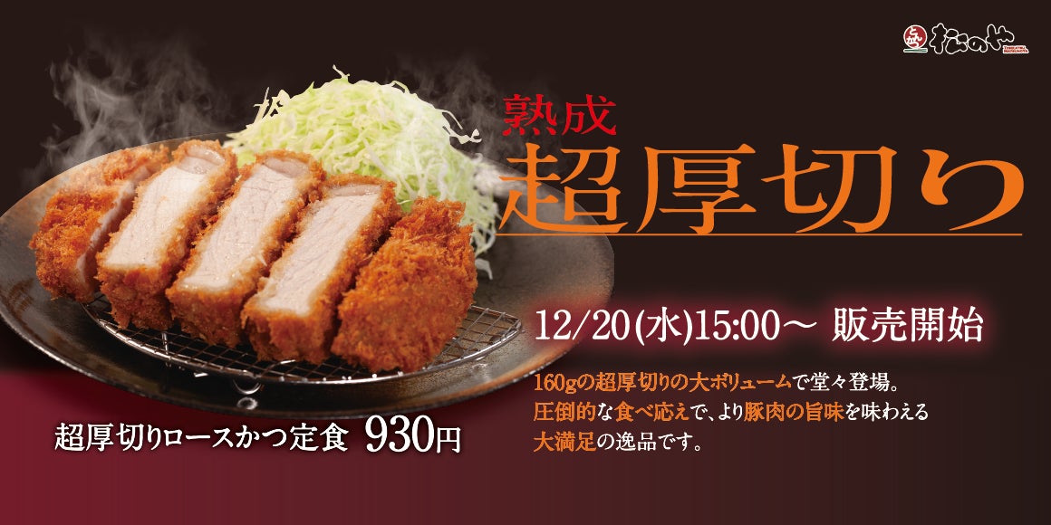 株式会社松屋フーズ(本社:東京都武蔵野市、代表取締役社長:瓦葺 一利)では、とんかつ専門店の「松のや」におきまして、2023年12月20日(水)午後3時より、「超厚切りロースかつ定食」を発売いたします。