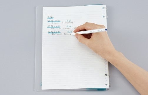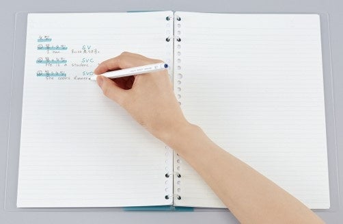 今回発売する「キャンパス ノートのように使えるバインダー」は、ページを自由に差し替えられるルーズリーフの良さはそのままに、リングが上下に分かれていることで、ルーズリーフを抜き差しせず綴じたまま筆記をしても手に当たりにくく、ノート感覚で使えるバインダーです。最大40枚の収容を可能としながら、スリムな設計を実現し、薄くて軽いので、教科ごとにバインダーを分けるという複数教科持ちがしやすくなっています。また、表紙にほどこしたヒンジ(溝)加工により、表紙を折り返して使うこともでき、省スペースでの筆記も可能です。サイズはA4サイズとB5サイズの2種類で、カラーはA4サイズがライトブルーとピンクの2色、B5サイズがネイビー、ライトブルー、グレー、ピンク、イエローの5色で教科ごとに使いやすいラインアップとなっています。
