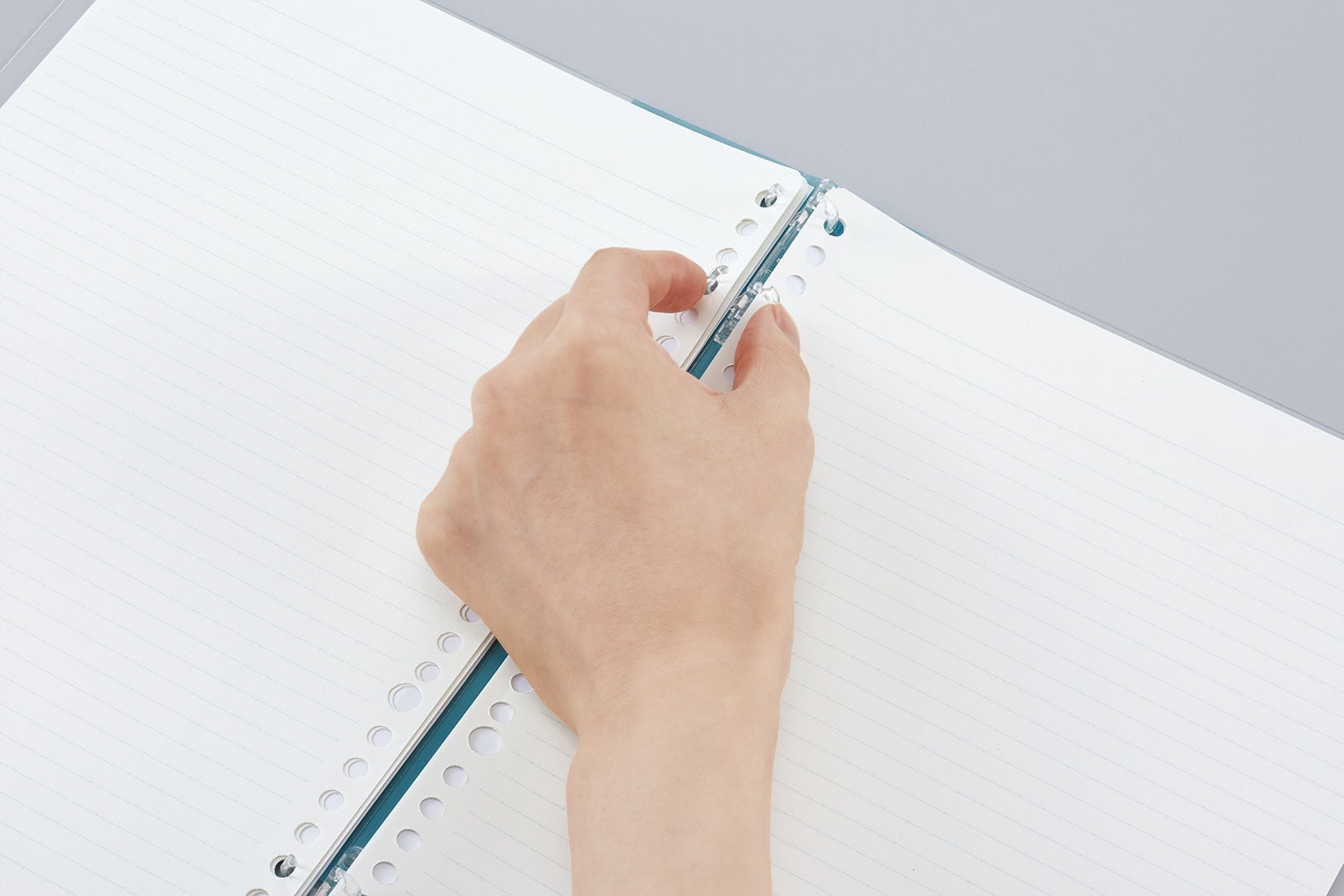 開けるときは、リングの上下を内側に軽くつまんで開き、綴じるときは左右からつまむと綴じるワンタッチ開閉。リングが4つで、とじ具に通す穴が少ないうえに、開いた状態で固定されるので、ルーズリーフの差し替えもスピーディーに行えます。