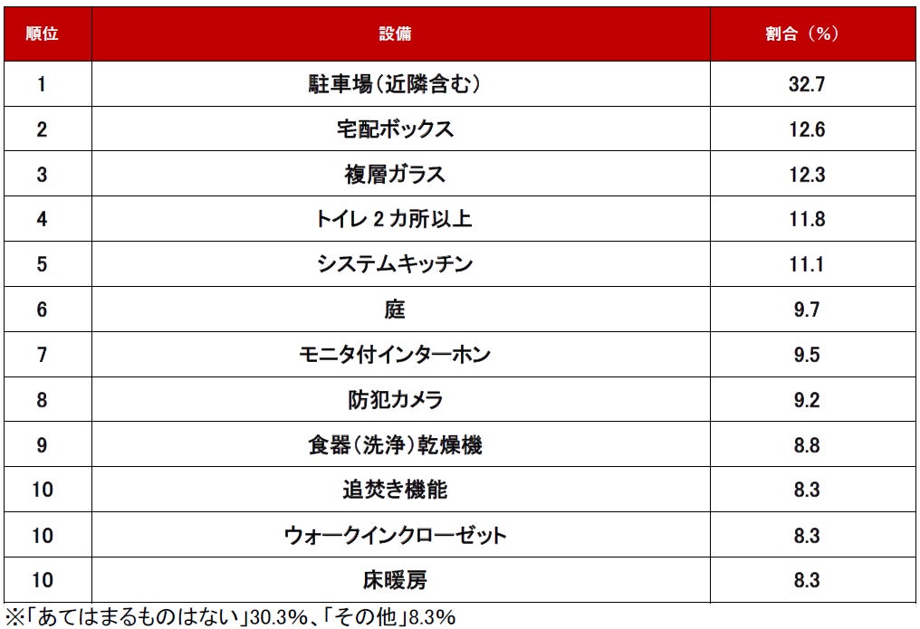 設備編の1位はマンション編と同じく「駐車場(近隣を含む)」でした。不動産会社からは、「共働きが増え、庭はなくても車2台を止められるスペースを希望する傾向が強い」「リモートワークが減り、車での通勤が増えた結果、駐車場需要が増えている」というコメントが見られました。