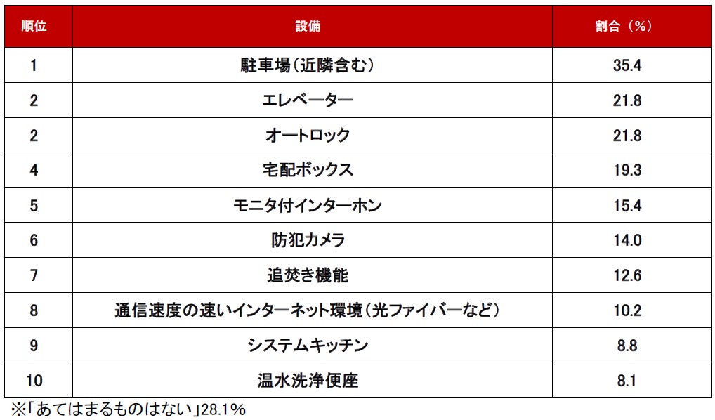 2位は「エレベーター」「オートロック」が21.8%でした。不動産会社からは「エレベーター」に対して「高齢者や身体に不安がある方にとってエレベーターは生活の質を大きく向上させる設備だから」というコメントが目立ちました。次に「オートロック」に対しては「防犯面を意識するお客さまが増加傾向にあるため」というコメントが上がり、「オートロック」だけではなく、「宅配ボックス」「モニタ付インターホン」などの防犯対策を意識する方が増えたようです。