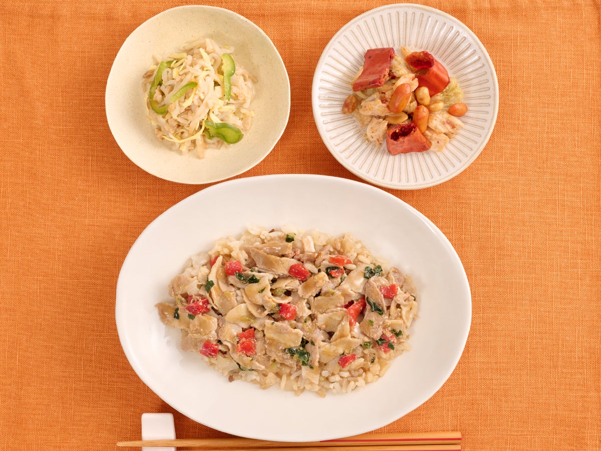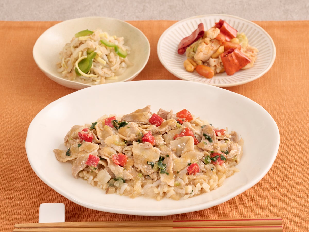 本格的なエスニックな風味で豚肉とご飯をたっぷりと味わっていただきたい!世界三大炊き込みご飯であり香港の冬の風物詩とも言われる「ボウジャイファン」をナッシュがアレンジしました!中華のシェフ特製のたっぷりなタレでご飯を包み込み、口当たりよく、食べ応えを感じていただけるように仕上げました。広東風甘味噌とオイスターソースが効いた濃厚タレと五香粉・生姜・しいたけの風味で、食が進みます!よく混ぜてお召し上がりください。副菜は、もやしと大豆ミートの塩だれ、ピーナッツたっぷりで食感の楽しい白菜と蒸し鶏の唐辛子あえです。