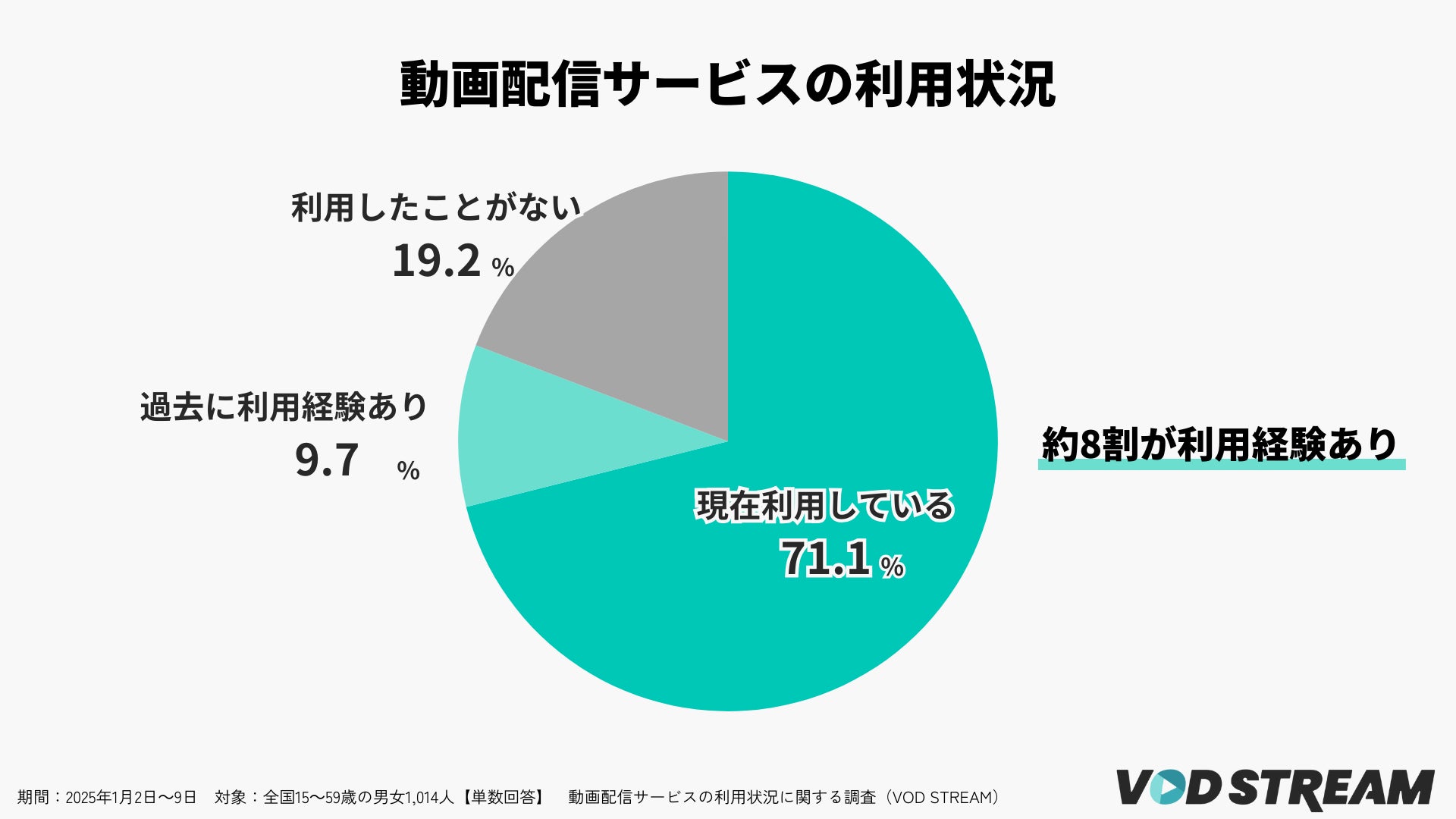 2025年1月2日~9日の期間で15歳から59歳の男女1,014人を対象に動画配信サービスの利用状況を調査したところ、「現在利用している」が71.1%、「過去に利用経験あり」が(9.7%)、「利用したことがない」が19.2%という結果でした。