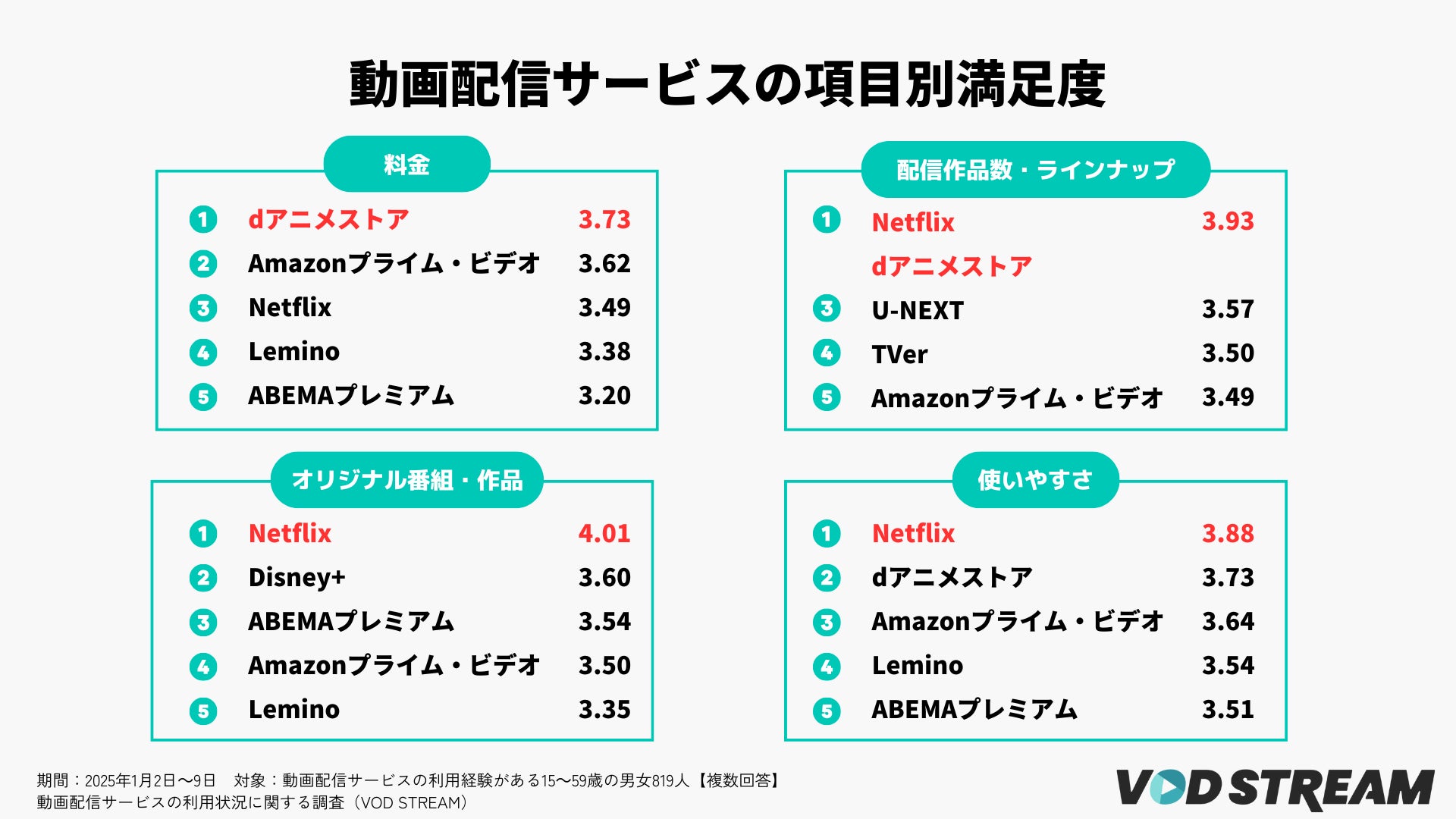 1位の「Netflix」は評価項目4部門中3部門で首位に輝いており、配信ジャンルの幅をはじめ、オリジナル作品の質や本数、選べる料金プラン、使い勝手の良さなどが総合的に評価された結果と考えられます。昨年の本調査(※3)における総合満足度2位から順位を上げ、1位に選ばれました。
