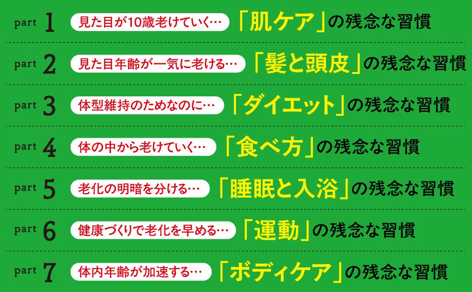 本書は、ベストセラー『日本人の9割がやっている残念な習慣』をはじめとする「残念な習慣シリーズ」の中から、日本人の多くが当たり前だと思っている生活習慣を見直し、なぜ老化につながるのか、どう変えればいいのかを紹介する。