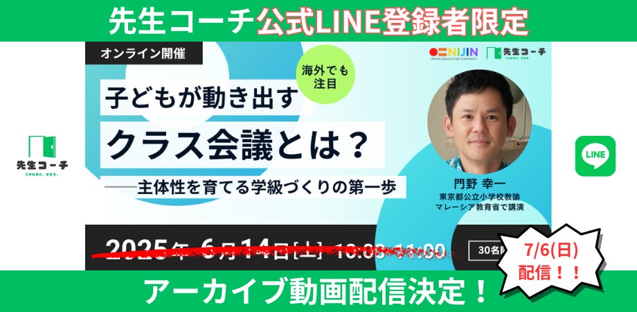 【先生コーチ】学級づくりに悩む先生方へ──主体性を育てる「クラス会議」セミナーのアーカイブ動画を無料公開|LINE登録者限定で7月6日配信