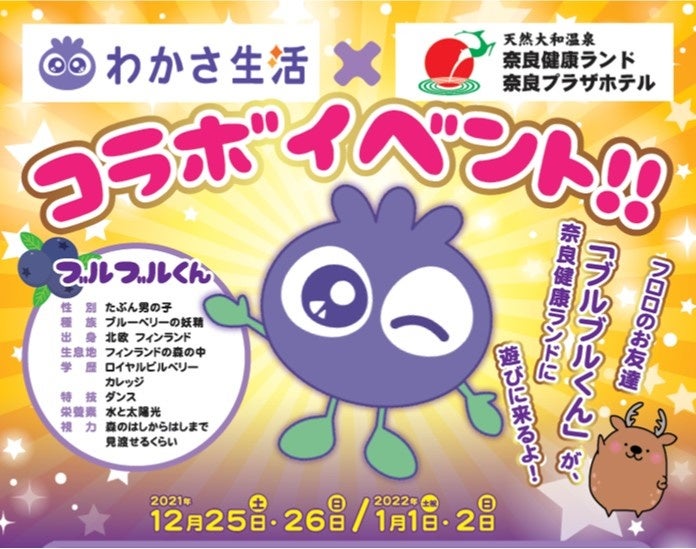 株式会社わかさ生活(本社:京都市下京区)は奈良健康ランド(所在:奈良県天理市)と2021年12月25日(土)、26日(日)、2022年1月1日(土)、2日(日)の期間限定で、コラボイベントを開催いたします。